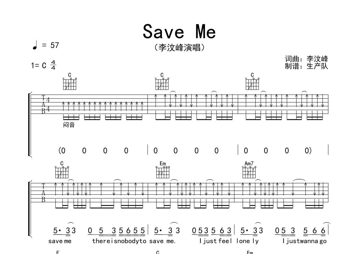 李汶峰《Save Me》吉他谱 - C调弹唱六线谱