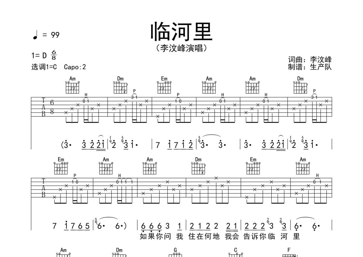 《临河里》是李汶峰演唱的一首歌曲,拍号为6/8拍,歌曲速度为每分钟99拍,歌曲原调为D调,但由于原调指法比较难,为了方便弹奏,本吉他谱采用的是C调指法编配,变调夹2品弹奏即为原调,当然也可以根据自己的音域改变变调夹位置,或者通过改变和弦调性,以方便自己弹奏,这份吉他谱共有三张高清图谱,图谱由 @生产队 编配上传,图谱使用六线谱编配,包含吉他和弦指法、简谱以及歌词部分,使用这份临河里吉他谱,可以让你更加方便地掌握这首歌曲的弹唱技巧,快来尝试吧。