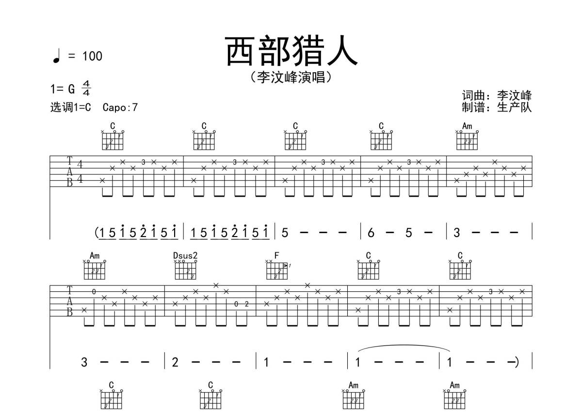 李汶峰《西部猎人》吉他谱 - C调弹唱六线谱