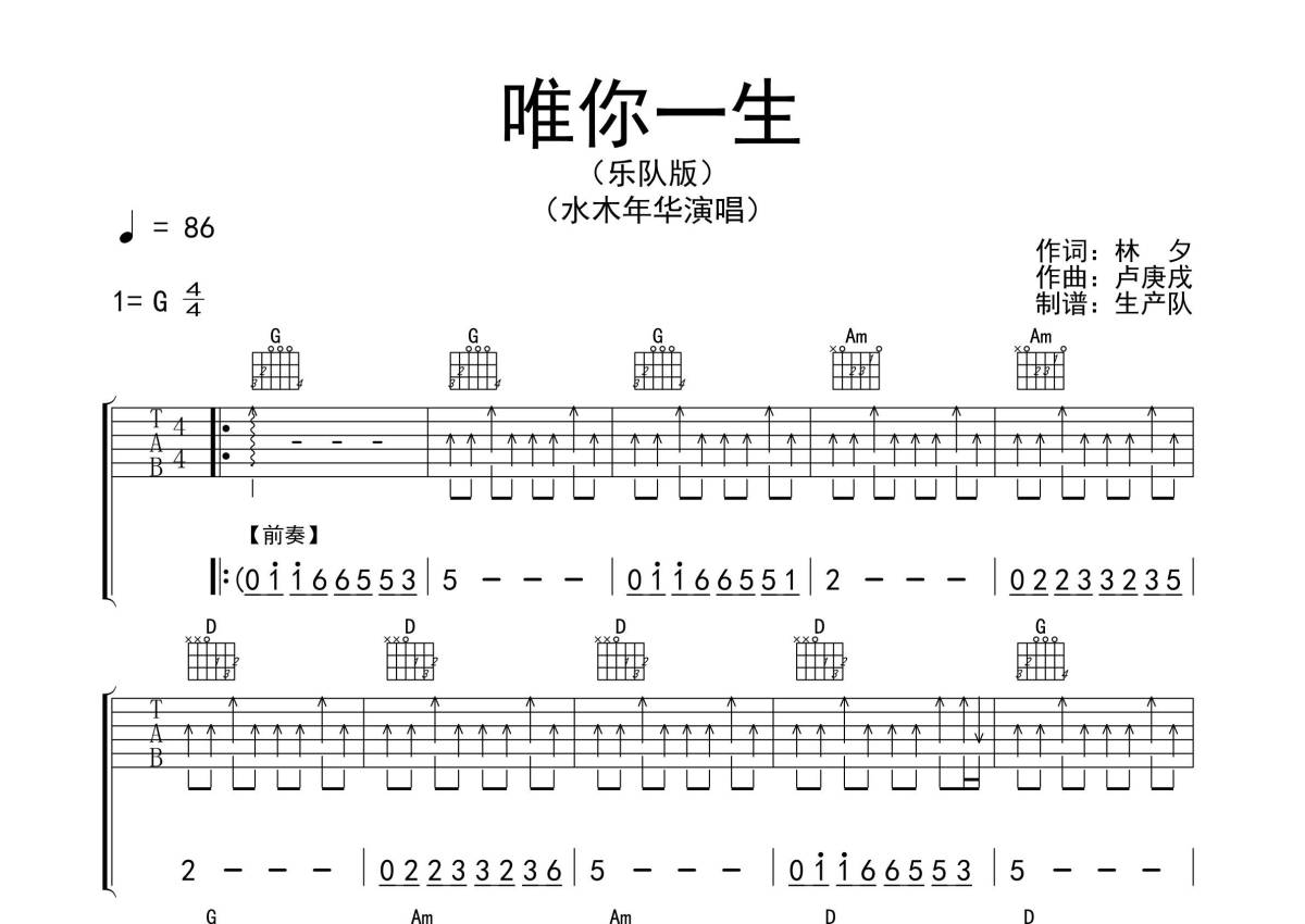 水木年华《唯你一生》吉他谱 - G调弹唱六线谱