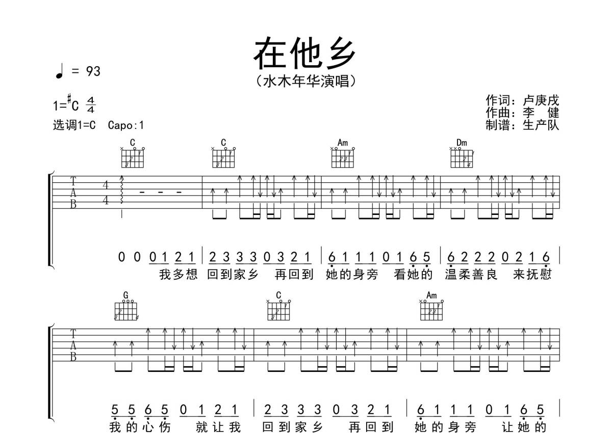 《在他乡》是水木年华演唱的一首歌曲,拍号为4/4拍,歌曲速度为每分钟93拍,歌曲原调为Db调,但由于原调指法比较难,为了方便弹奏,本吉他谱采用的是C调指法编配,变调夹1品弹奏即为原调,当然也可以根据自己的音域改变变调夹位置,或者通过改变和弦调性,以方便自己弹奏,这份吉他谱共有三张高清图谱,图谱由 @生产队 编配上传,图谱使用六线谱编配,包含吉他和弦指法、简谱以及歌词部分,使用这份在他乡吉他谱,可以让你更加方便地掌握这首歌曲的弹唱技巧,快来尝试吧。