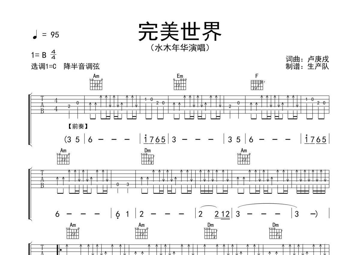 《完美世界》是水木年华演唱的一首歌曲,拍号为4/4拍,歌曲速度为每分钟95拍,歌曲原调为B调,但由于原调指法比较难,为了方便弹奏,本吉他谱采用的是C调指法编配,降半音调弦弹奏即为原调,当然也可以根据自己的音域决定是否调弦,这份吉他谱共有三张高清图谱,图谱由 @生产队 编配上传,图谱使用六线谱编配,包含吉他和弦指法、简谱以及歌词部分,使用这份完美世界吉他谱,可以让你更加方便地掌握这首歌曲的弹唱技巧,快来尝试吧。
