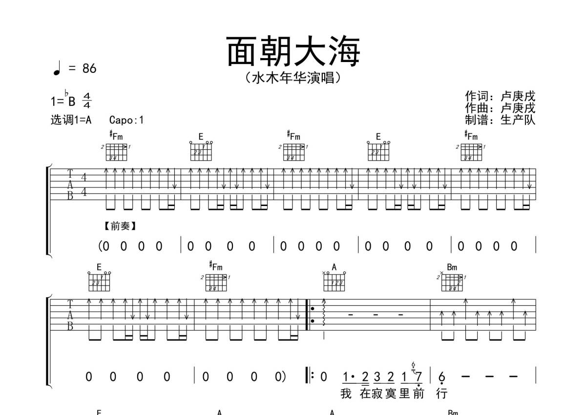 《面朝大海》是水木年华演唱的一首歌曲,拍号为4/4拍,歌曲速度为每分钟86拍,歌曲原调为Bb调,但由于原调指法比较难,为了方便弹奏,本吉他谱采用的是A调指法编配,变调夹1品弹奏即为原调,当然也可以根据自己的音域改变变调夹位置,或者通过改变和弦调性,以方便自己弹奏,这份吉他谱共有三张高清图谱,图谱由 @生产队 编配上传,图谱使用六线谱编配,包含吉他和弦指法、简谱以及歌词部分,使用这份面朝大海吉他谱,可以让你更加方便地掌握这首歌曲的弹唱技巧,快来尝试吧。