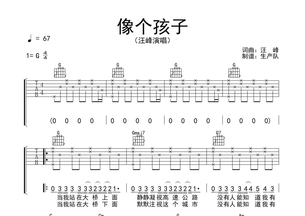 汪峰《像个孩子》吉他谱 - G调弹唱六线谱