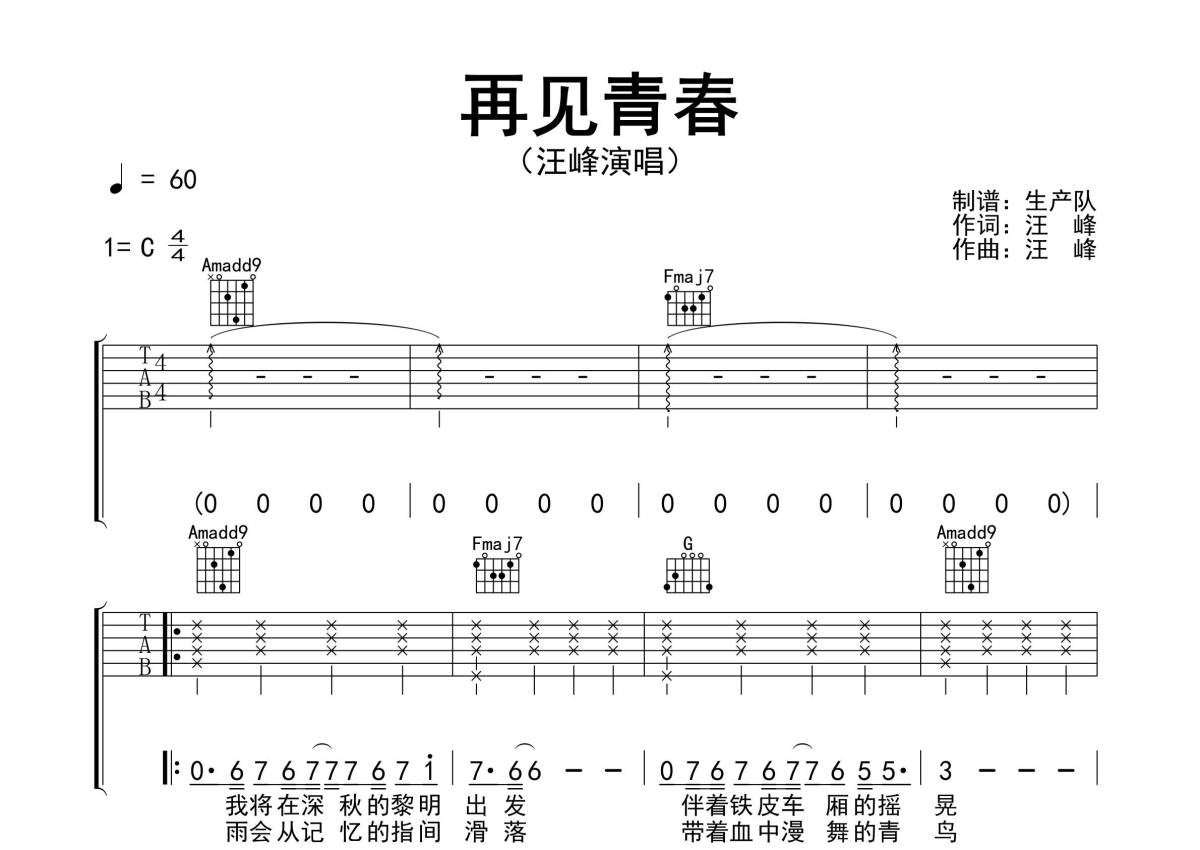 汪峰《再见青春》吉他谱 - C调弹唱六线谱