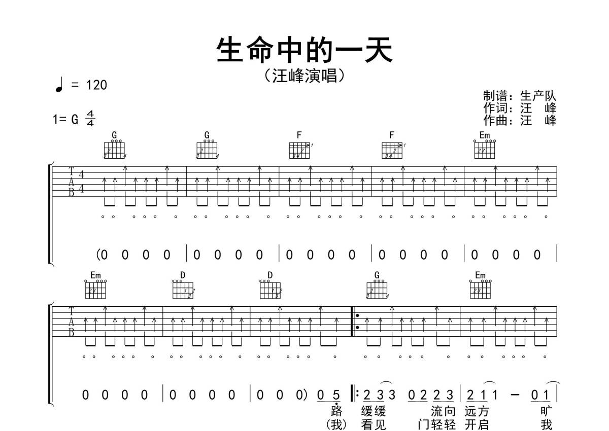 《生命中的一天》是汪峰演唱的一首歌曲,拍号为4/4拍,歌曲速度为每分钟120拍,歌曲原调为G调,本吉他谱采用的是G调指法编配,演奏时不需要使用变调夹即为原调,这份吉他谱共有四张高清图谱,图谱由 @生产队 编配上传,图谱使用六线谱编配,包含吉他和弦指法、简谱以及歌词部分,使用这份生命中的一天吉他谱,可以让你更加方便地掌握这首歌曲的弹唱技巧,快来尝试吧。