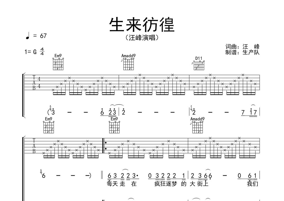 《生来彷徨》是汪峰演唱的一首歌曲,拍号为4/4拍,歌曲速度为每分钟67拍,歌曲原调为G调,本吉他谱采用的是G调指法编配,演奏时不需要使用变调夹即为原调,这份吉他谱共有四张高清图谱,图谱由 @生产队 编配上传,图谱使用六线谱编配,包含吉他和弦指法、简谱以及歌词部分,使用这份生来彷徨吉他谱,可以让你更加方便地掌握这首歌曲的弹唱技巧,快来尝试吧。