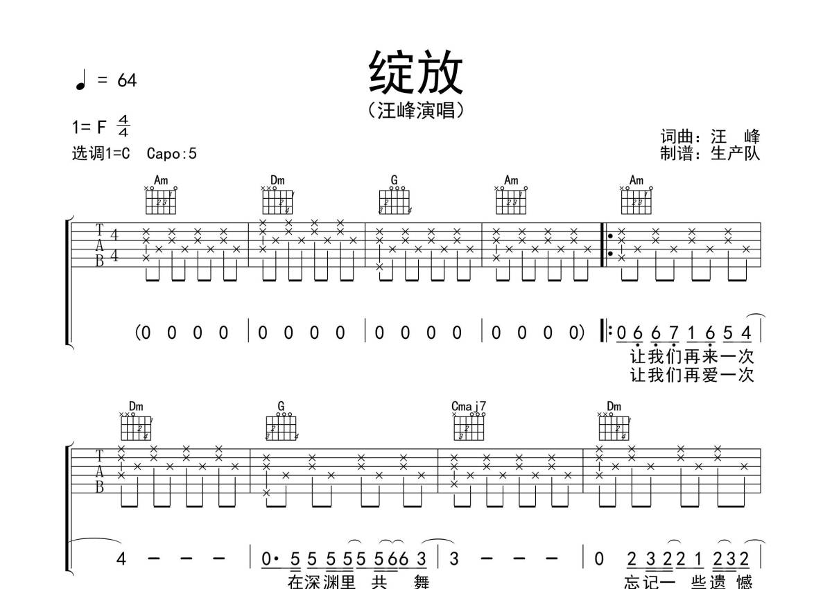 汪峰《绽放》吉他谱 - C调弹唱六线谱