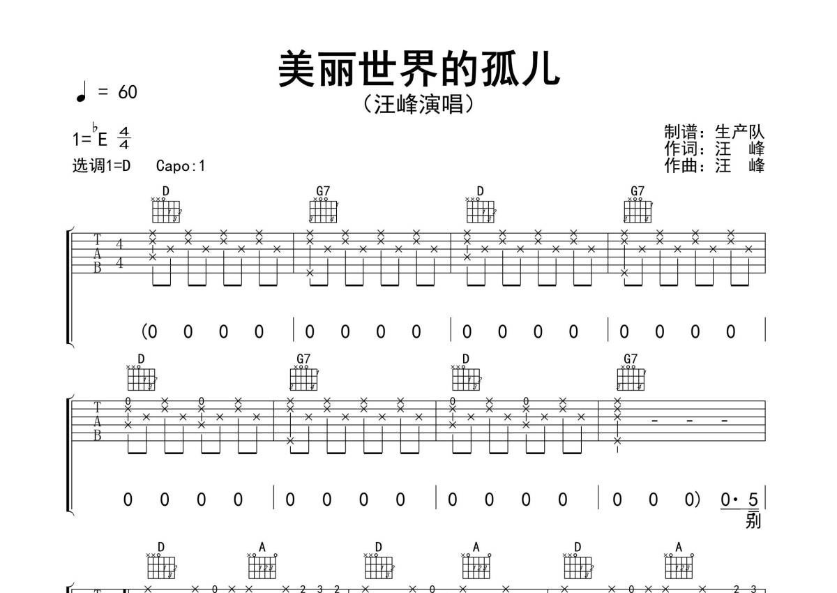 汪峰《美丽世界的孤儿》吉他谱 - D调弹唱六线谱