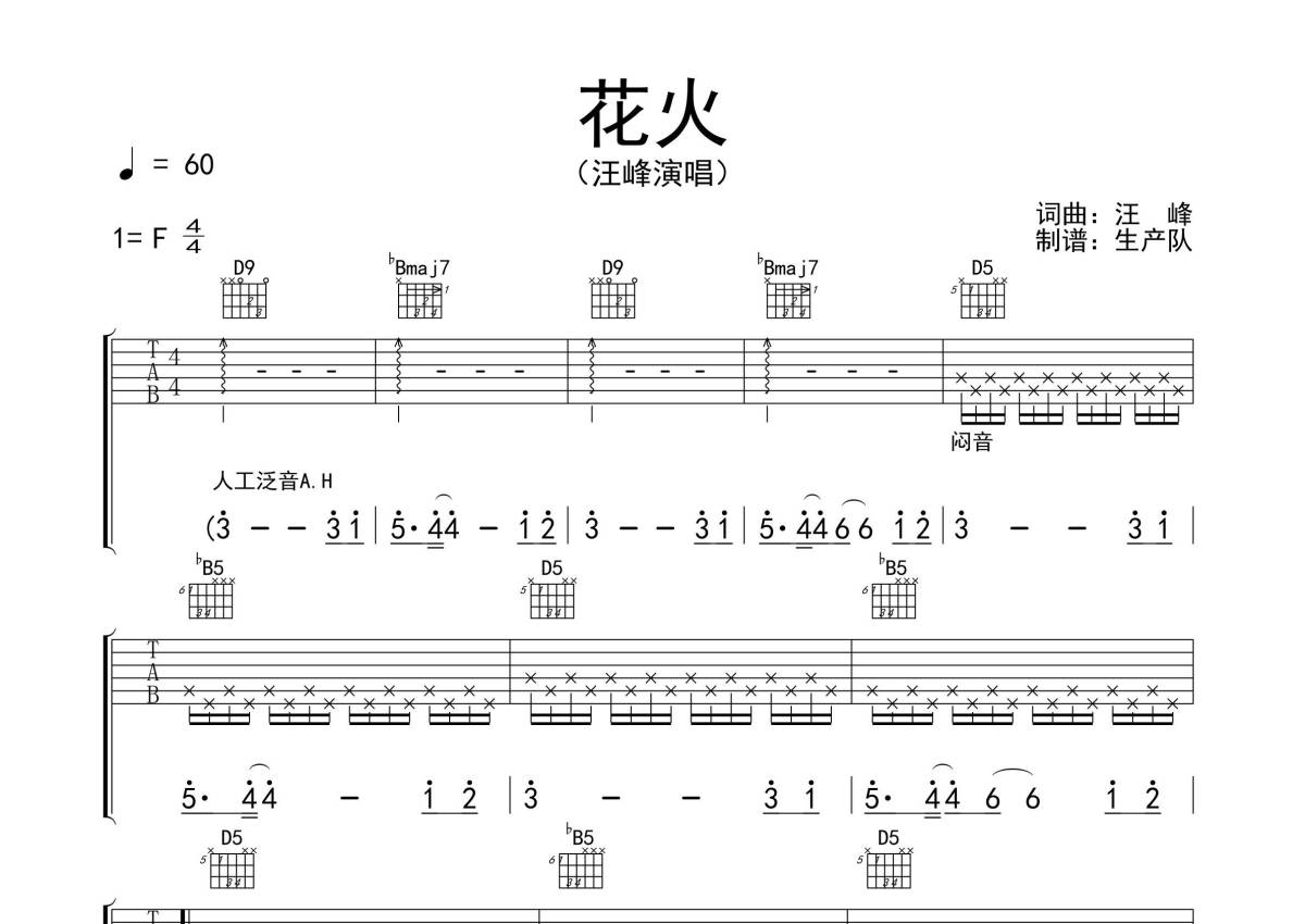汪峰《花火》吉他谱 - F调弹唱六线谱