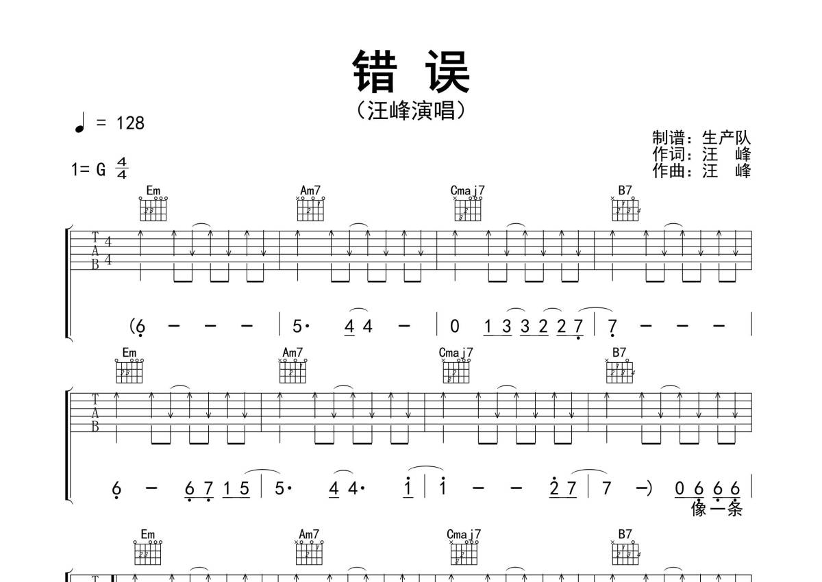 汪峰《错误》吉他谱 - G调弹唱六线谱