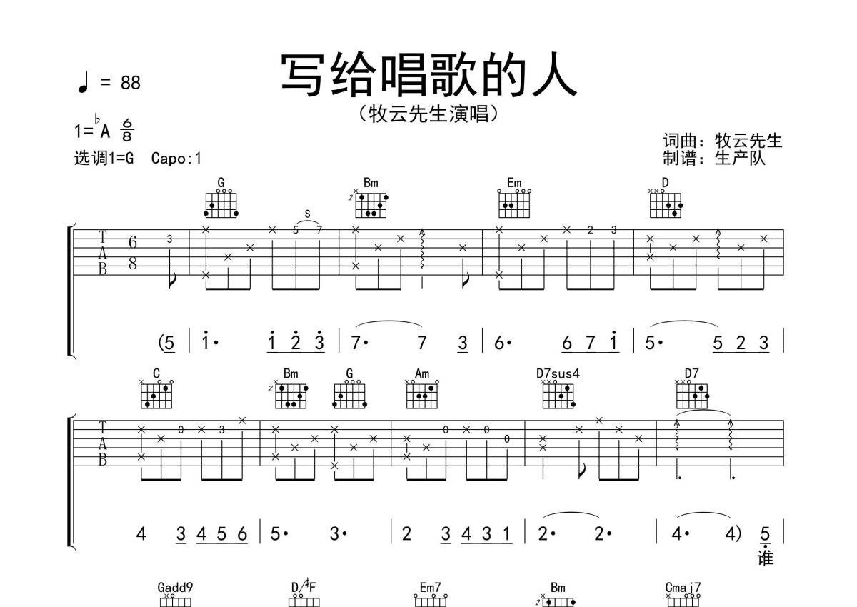 牧云先生《写给唱歌的人》吉他谱 - G调弹唱六线谱