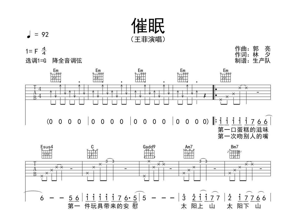 《催眠》是王菲演唱的一首歌曲,拍号为4/4拍,歌曲速度为每分钟92拍,歌曲原调为F调,但由于原调指法比较难,为了方便弹奏,本吉他谱采用的是G调指法编配,这份吉他谱共有三张高清图谱,图谱由 @生产队 编配上传,图谱使用六线谱编配,包含吉他和弦指法、简谱以及歌词部分,使用这份催眠吉他谱,可以让你更加方便地掌握这首歌曲的弹唱技巧,快来尝试吧。