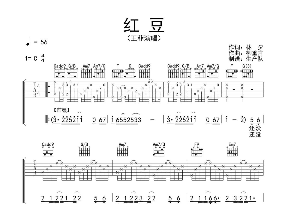 《红豆》是王菲演唱的一首歌曲,拍号为4/4拍,歌曲速度为每分钟56拍,歌曲原调为C调,本吉他谱采用的是C调指法编配,演奏时不需要使用变调夹即为原调,这份吉他谱共有三张高清图谱,图谱由 @生产队 编配上传,图谱使用六线谱编配,包含吉他和弦指法、简谱以及歌词部分,使用这份红豆吉他谱,可以让你更加方便地掌握这首歌曲的弹唱技巧,快来尝试吧。