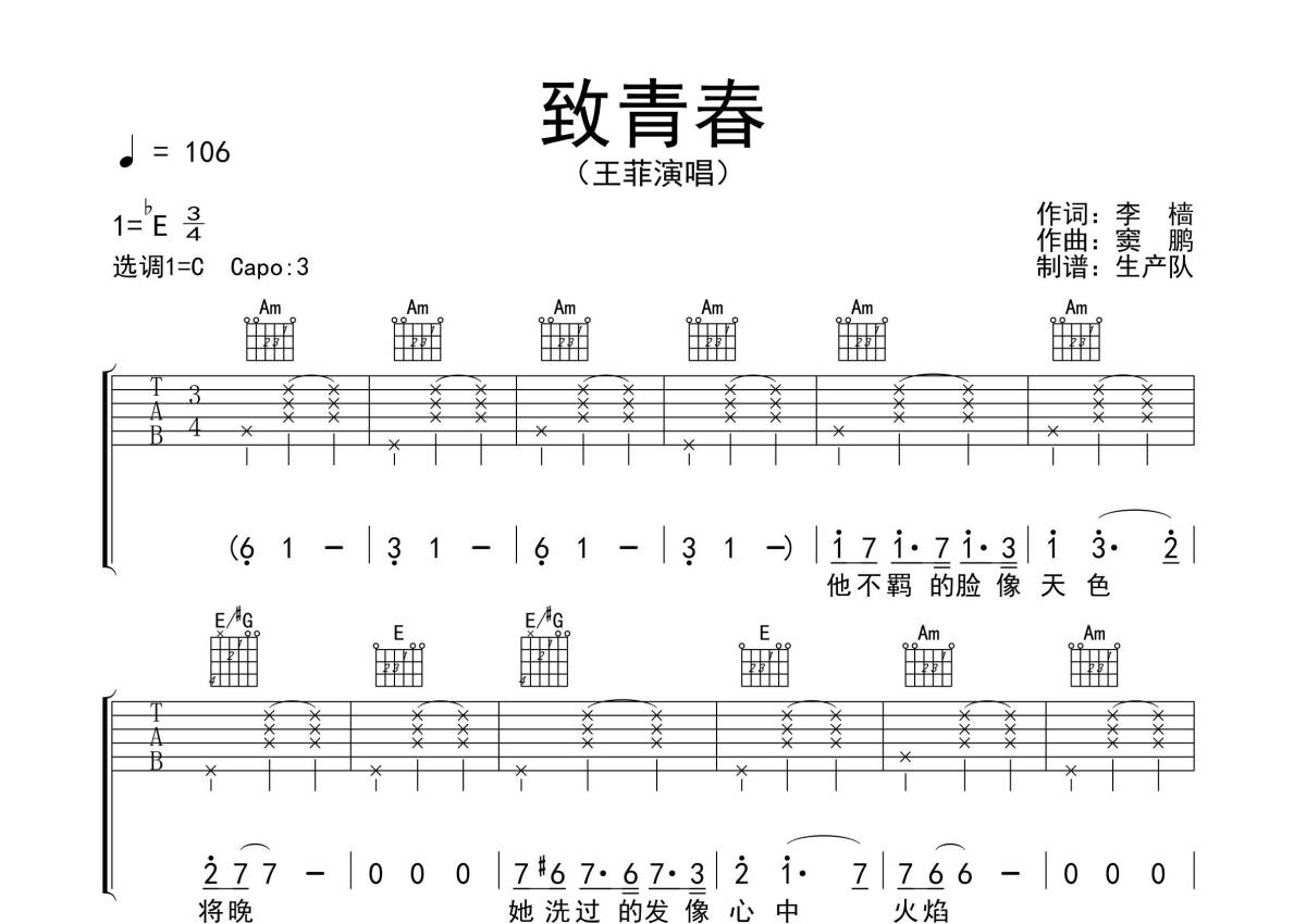 《致青春》是王菲演唱的一首歌曲,拍号为3/4拍,歌曲速度为每分钟106拍,歌曲原调为Eb调,但由于原调指法比较难,为了方便弹奏,本吉他谱采用的是C调指法编配,变调夹3品弹奏即为原调,当然也可以根据自己的音域改变变调夹位置,或者通过改变和弦调性,以方便自己弹奏,这份吉他谱共有四张高清图谱,图谱由 @生产队 编配上传,图谱使用六线谱编配,包含吉他和弦指法、简谱以及歌词部分,使用这份致青春吉他谱,可以让你更加方便地掌握这首歌曲的弹唱技巧,快来尝试吧。