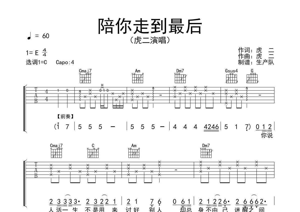 虎二《陪你走到最后》吉他谱 - C调弹唱六线谱