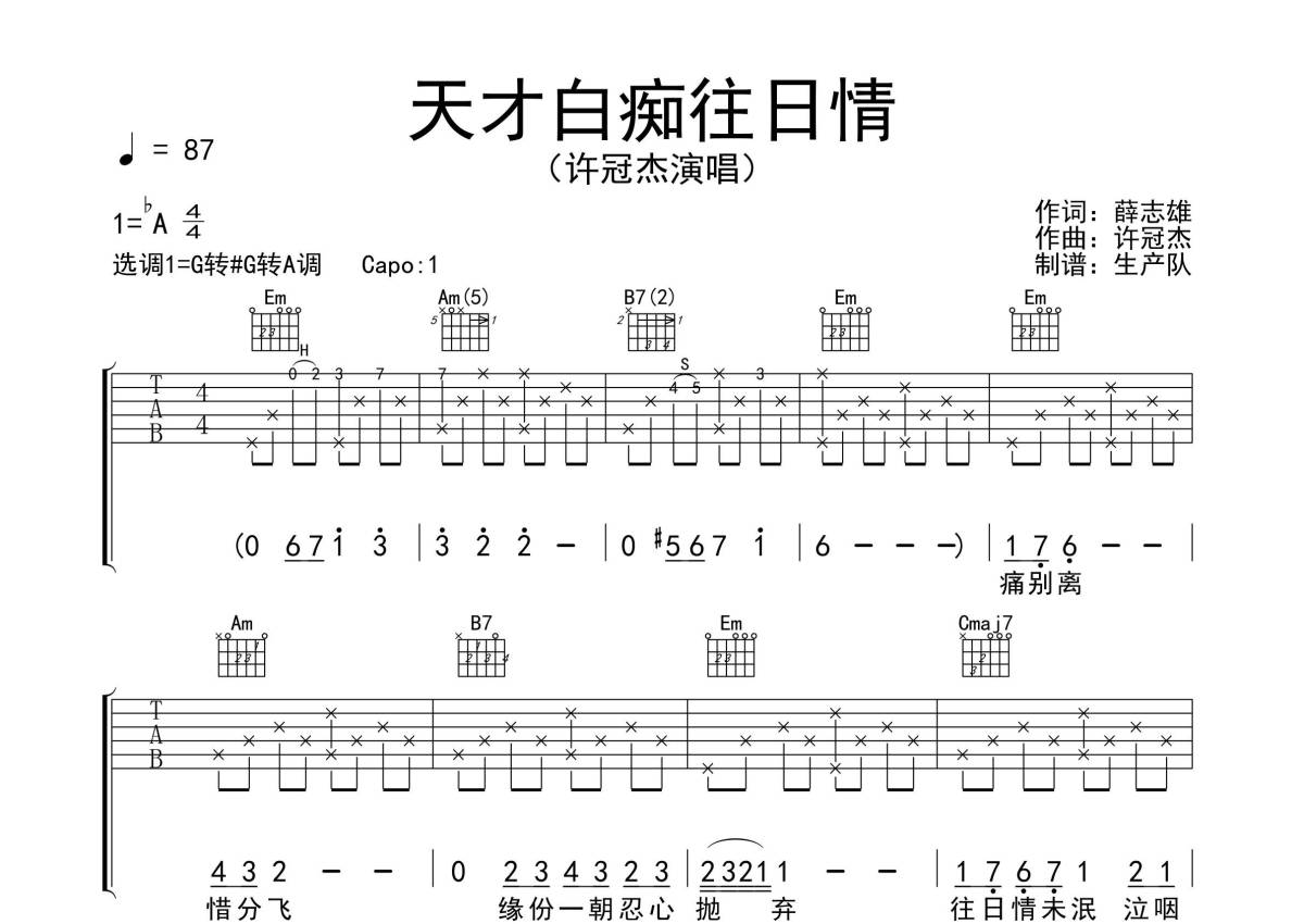 《天才白痴往日情》是许冠杰演唱的一首歌曲,拍号为4/4拍,歌曲速度为每分钟87拍,歌曲原调为Ab调,但由于原调指法比较难,为了方便弹奏,本吉他谱采用的是G调指法编配,变调夹1品弹奏即为原调,当然也可以根据自己的音域改变变调夹位置,或者通过改变和弦调性,以方便自己弹奏,这份吉他谱共有三张高清图谱,图谱由 @生产队 编配上传,图谱使用六线谱编配,包含吉他和弦指法、简谱以及歌词部分,使用这份天才白痴往日情吉他谱,可以让你更加方便地掌握这首歌曲的弹唱技巧,快来尝试吧。