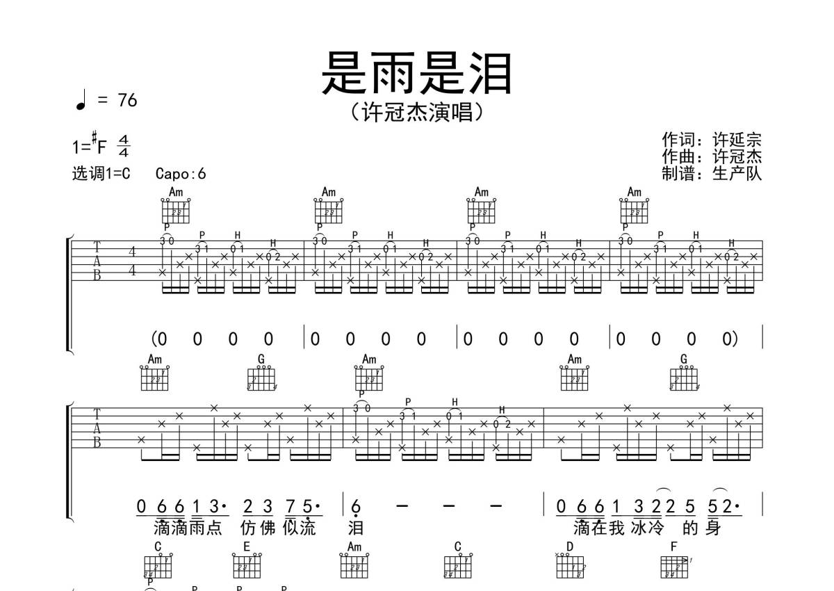 《是雨是泪》是许冠杰演唱的一首歌曲,拍号为4/4拍,歌曲速度为每分钟76拍,歌曲原调为Gb调,但由于原调指法比较难,为了方便弹奏,本吉他谱采用的是C调指法编配,变调夹6品弹奏即为原调,当然也可以根据自己的音域改变变调夹位置,或者通过改变和弦调性,以方便自己弹奏,这份吉他谱共有四张高清图谱,图谱由 @生产队 编配上传,图谱使用六线谱编配,包含吉他和弦指法、简谱以及歌词部分,使用这份是雨是泪吉他谱,可以让你更加方便地掌握这首歌曲的弹唱技巧,快来尝试吧。