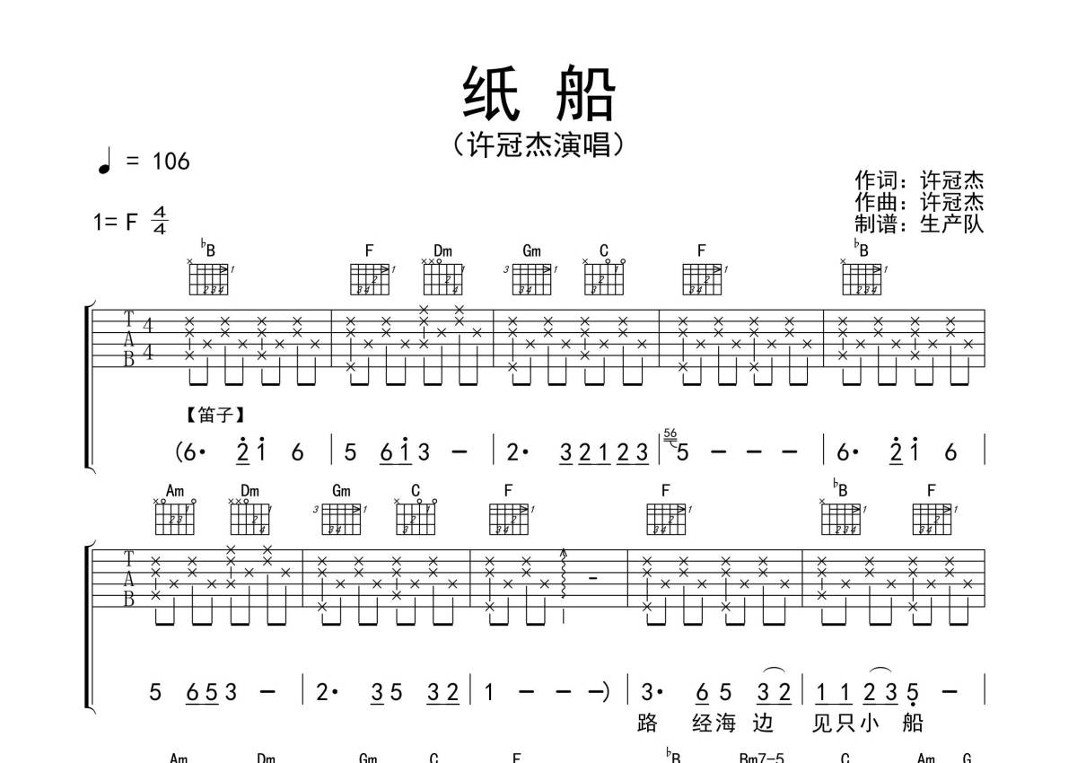 《纸船》是许冠杰演唱的一首歌曲,拍号为4/4拍,歌曲速度为每分钟106拍,歌曲原调为F调,但由于原调指法比较难,为了方便弹奏,本吉他谱采用的是F调指法编配,演奏时不需要使用变调夹即为原调,这份吉他谱共有三张高清图谱,图谱由 @生产队 编配上传,图谱使用六线谱编配,包含吉他和弦指法、简谱以及歌词部分,使用这份纸船吉他谱,可以让你更加方便地掌握这首歌曲的弹唱技巧,快来尝试吧。