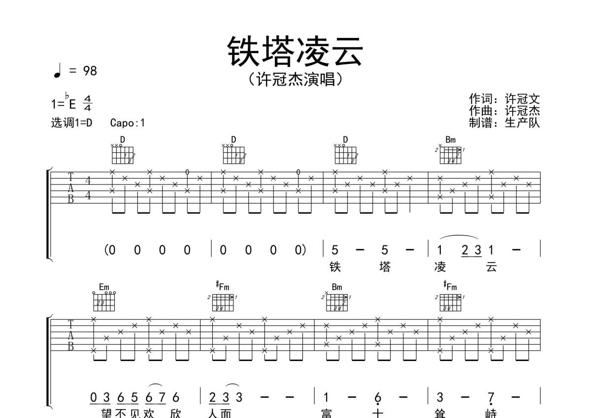 《铁塔凌云》是许冠杰演唱的一首歌曲,拍号为4/4拍,歌曲速度为每分钟98拍,歌曲原调为Eb调,但由于原调指法比较难,为了方便弹奏,本吉他谱采用的是D调指法编配,变调夹1品弹奏即为原调,当然也可以根据自己的音域改变变调夹位置,或者通过改变和弦调性,以方便自己弹奏,这份吉他谱共有三张高清图谱,图谱由 @生产队 编配上传,图谱使用六线谱编配,包含吉他和弦指法、简谱以及歌词部分,使用这份铁塔凌云吉他谱,可以让你更加方便地掌握这首歌曲的弹唱技巧,快来尝试吧。