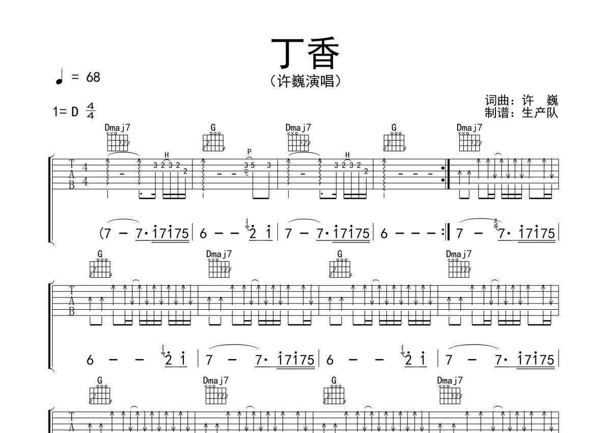 《丁香》是许巍演唱的一首歌曲,拍号为4/4拍,歌曲速度为每分钟68拍,歌曲原调为D调,但由于原调指法比较难,为了方便弹奏,本吉他谱采用的是D调指法编配,演奏时不需要使用变调夹即为原调,这份吉他谱共有四张高清图谱,图谱由 @生产队 编配上传,图谱使用六线谱编配,包含吉他和弦指法、简谱以及歌词部分,使用这份丁香吉他谱,可以让你更加方便地掌握这首歌曲的弹唱技巧,快来尝试吧。