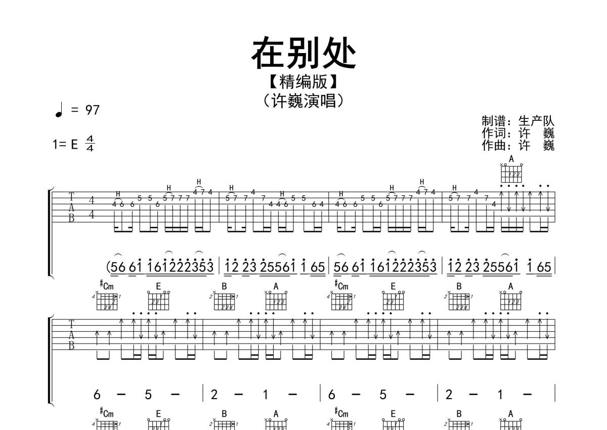 许巍《在别处》吉他谱 - E调弹唱六线谱