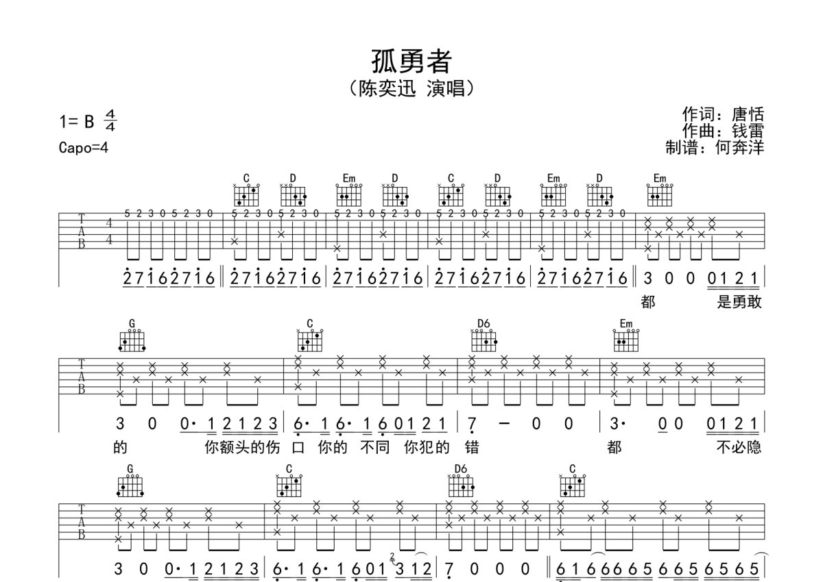 陈奕迅《孤勇者》吉他谱 - G调弹唱六线谱