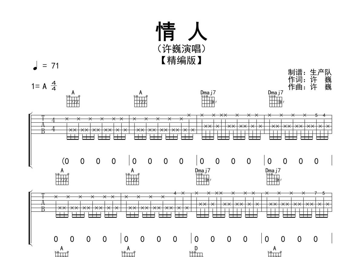《情人》是许巍演唱的一首歌曲,拍号为4/4拍,歌曲速度为每分钟71拍,歌曲原调为A调,但由于原调指法比较难,为了方便弹奏,本吉他谱采用的是A调指法编配,演奏时不需要使用变调夹即为原调,这份吉他谱共有四张高清图谱,图谱由 @生产队 编配上传,图谱使用六线谱编配,包含吉他和弦指法、简谱以及歌词部分,使用这份情人吉他谱,可以让你更加方便地掌握这首歌曲的弹唱技巧,快来尝试吧。