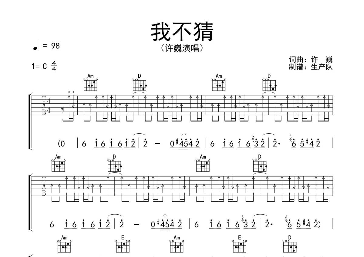 《我不猜》是许巍演唱的一首歌曲,拍号为4/4拍,歌曲速度为每分钟98拍,歌曲原调为C调,本吉他谱采用的是C调指法编配,演奏时不需要使用变调夹即为原调,这份吉他谱共有三张高清图谱,图谱由 @生产队 编配上传,图谱使用六线谱编配,包含吉他和弦指法、简谱以及歌词部分,使用这份我不猜吉他谱,可以让你更加方便地掌握这首歌曲的弹唱技巧,快来尝试吧。