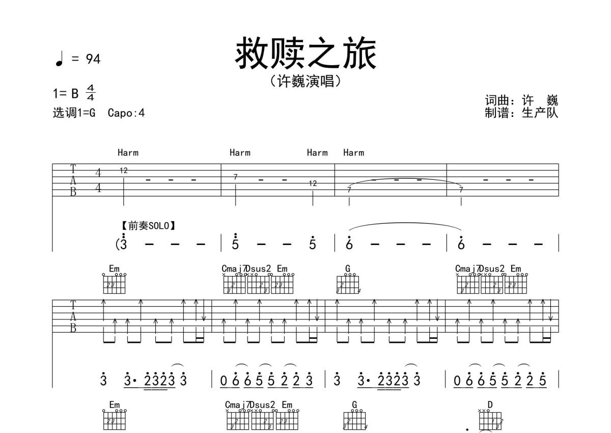 《救赎之旅》是许巍演唱的一首歌曲,拍号为4/4拍,歌曲速度为每分钟94拍,歌曲原调为B调,但由于原调指法比较难,为了方便弹奏,本吉他谱采用的是G调指法编配,变调夹4品弹奏即为原调,当然也可以根据自己的音域改变变调夹位置,或者通过改变和弦调性,以方便自己弹奏,这份吉他谱共有五张高清图谱,图谱由 @生产队 编配上传,图谱使用六线谱编配,包含吉他和弦指法、简谱以及歌词部分,使用这份救赎之旅吉他谱,可以让你更加方便地掌握这首歌曲的弹唱技巧,快来尝试吧。