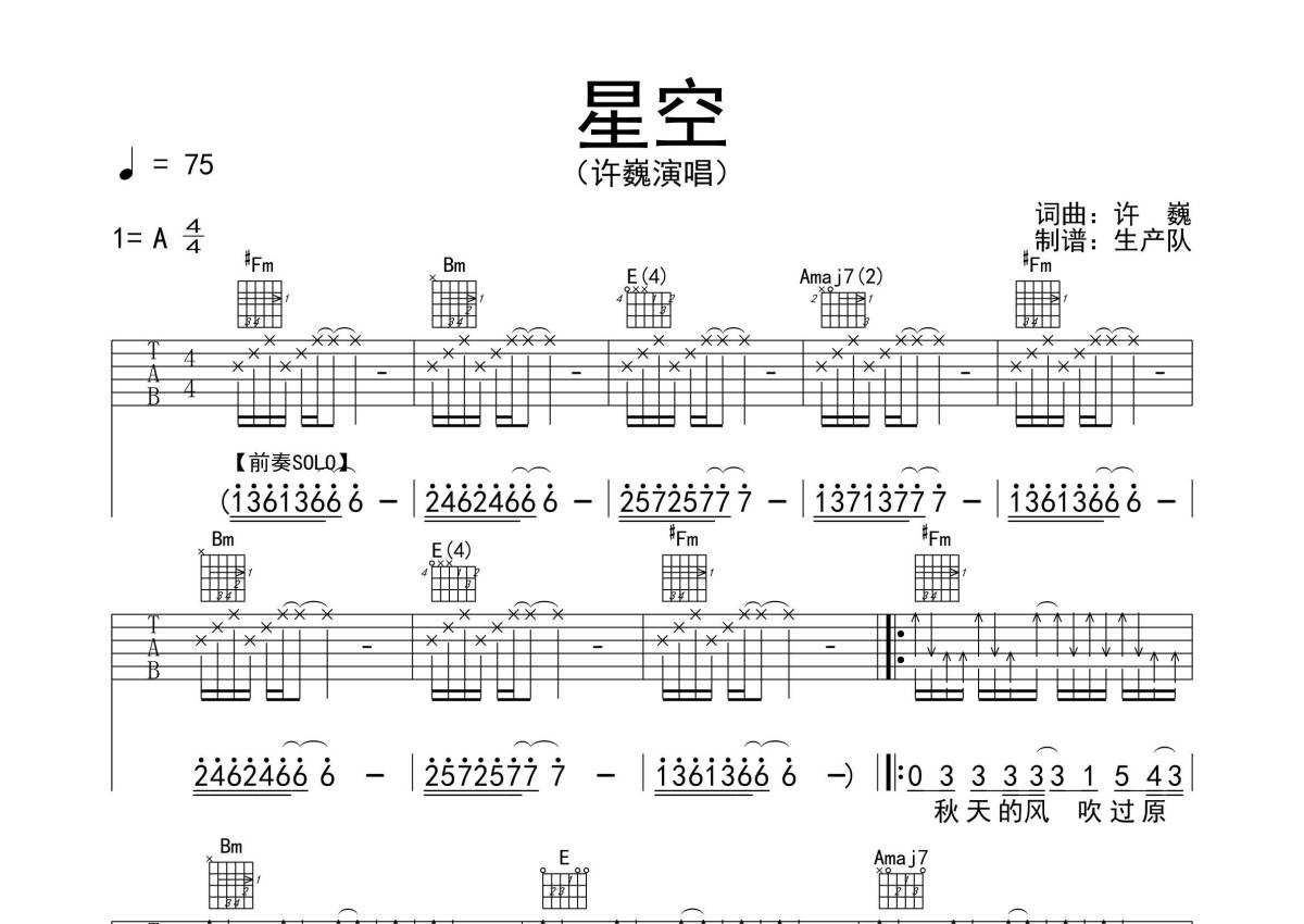 《星空》是许巍演唱的一首歌曲,拍号为4/4拍,歌曲速度为每分钟75拍,歌曲原调为A调,但由于原调指法比较难,为了方便弹奏,本吉他谱采用的是A调指法编配,演奏时不需要使用变调夹即为原调,这份吉他谱共有三张高清图谱,图谱由 @生产队 编配上传,图谱使用六线谱编配,包含吉他和弦指法、简谱以及歌词部分,使用这份星空吉他谱,可以让你更加方便地掌握这首歌曲的弹唱技巧,快来尝试吧。