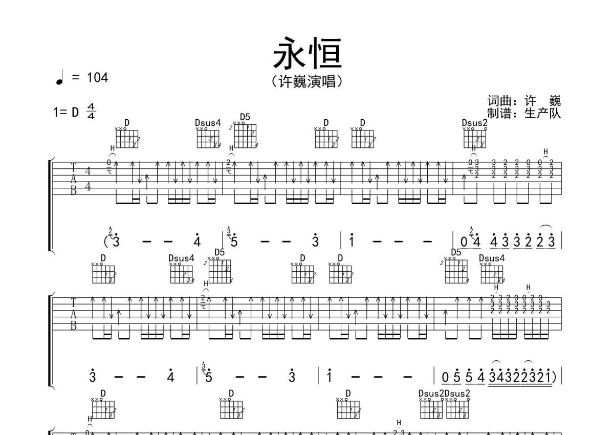 许巍《永恒》吉他谱 - D调弹唱六线谱