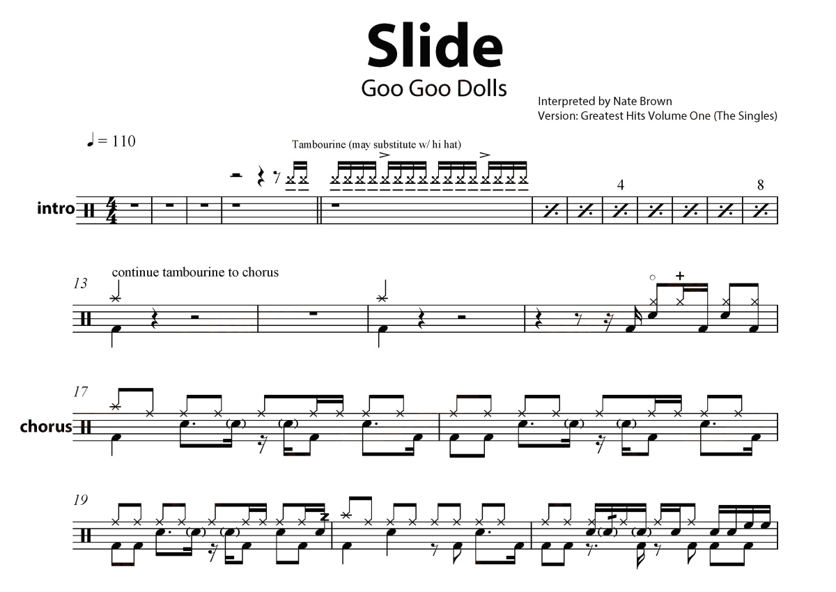 《Slide》是Goo Goo Dolls演唱的一首歌曲,这份鼓谱共有四张高清图谱,图谱由 @打鼓谱 编配上传,图谱使用五线谱编配,使用这份Slide架子鼓谱,你将能够轻松地敲打出这首Goo Goo Dolls的Slide,快来尝试吧。《Slide》现场版。Goo Goo Dolls 成立于美国纽约水牛城的三人摇滚团体。成军15年以来发行过6张专辑,前4年摸索期所发行的两张专辑并未让他们尝到成名的滋味,却使得其乐风在乐坛中留下良好的印象。1991年的第三张专辑开始渐露头角,逐渐发展起来。