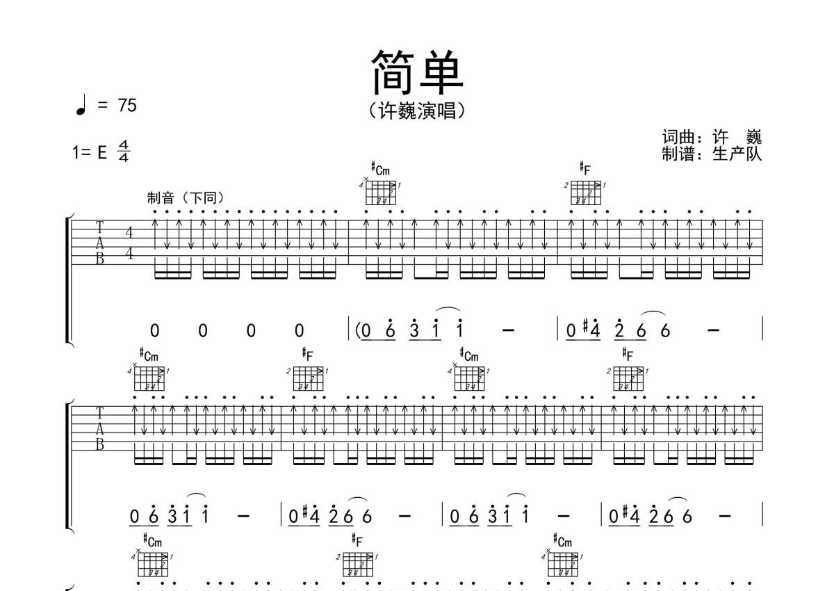 《简单》是许巍演唱的一首歌曲,拍号为4/4拍,歌曲速度为每分钟75拍,歌曲原调为E调,但由于原调指法比较难,为了方便弹奏,本吉他谱采用的是E调指法编配,演奏时不需要使用变调夹即为原调,这份吉他谱共有三张高清图谱,图谱由 @生产队 编配上传,图谱使用六线谱编配,包含吉他和弦指法、简谱以及歌词部分,使用这份简单吉他谱,可以让你更加方便地掌握这首歌曲的弹唱技巧,快来尝试吧。