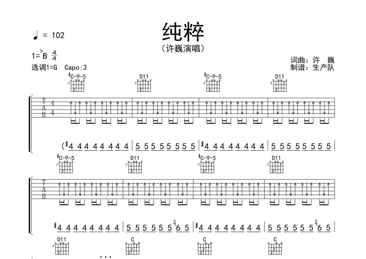 《纯粹》是许巍演唱的一首歌曲,拍号为4/4拍,歌曲速度为每分钟102拍,歌曲原调为Bb调,但由于原调指法比较难,为了方便弹奏,本吉他谱采用的是G调指法编配,变调夹3品弹奏即为原调,当然也可以根据自己的音域改变变调夹位置,或者通过改变和弦调性,以方便自己弹奏,这份吉他谱共有四张高清图谱,图谱由 @生产队 编配上传,图谱使用六线谱编配,包含吉他和弦指法、简谱以及歌词部分,使用这份纯粹吉他谱,可以让你更加方便地掌握这首歌曲的弹唱技巧,快来尝试吧。