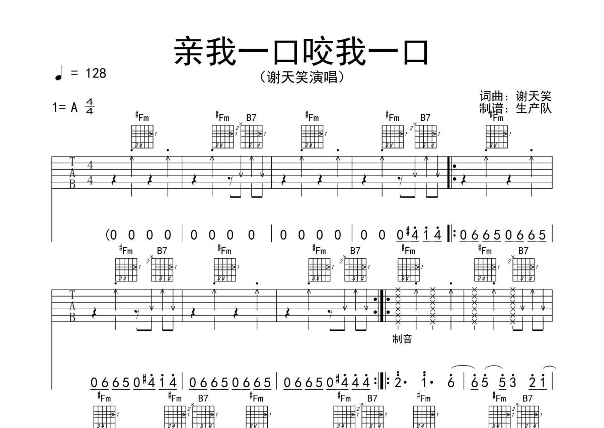 谢天笑《亲我一口咬我一口》吉他谱 - A调弹唱六线谱