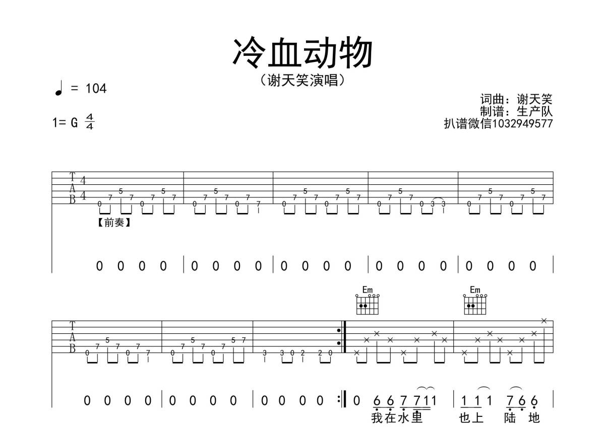 谢天笑《冷血动物》吉他谱 - G调弹唱六线谱