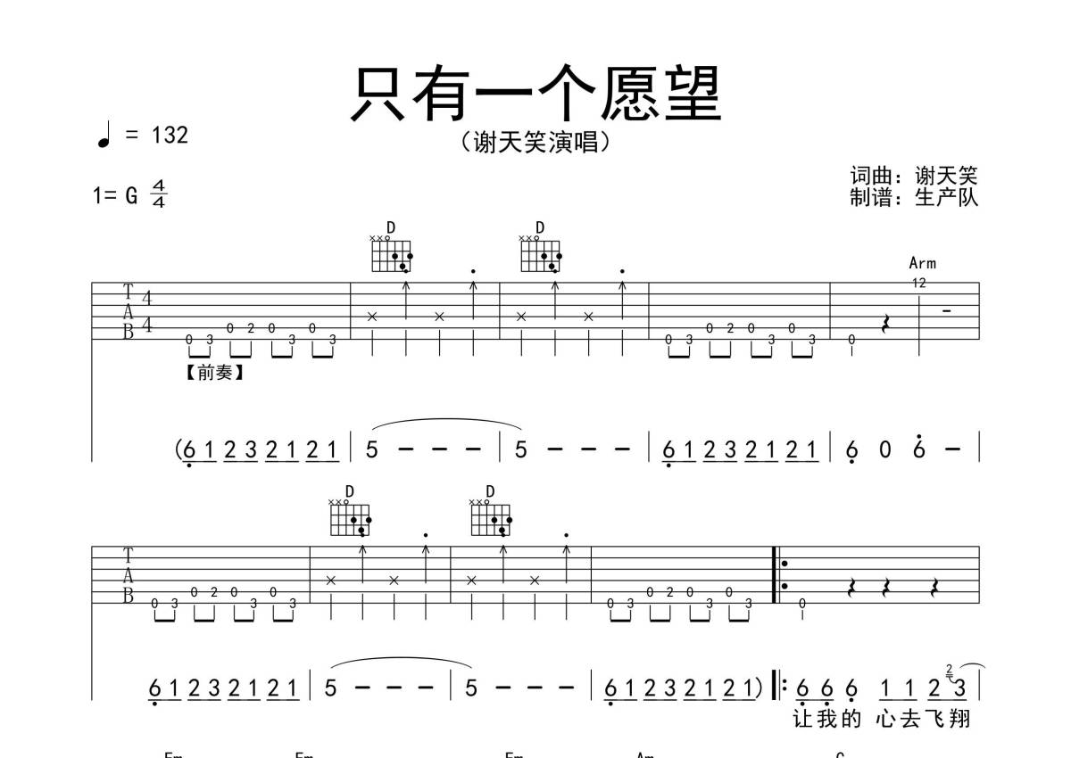 谢天笑《只有一个愿望》吉他谱 - G调弹唱六线谱