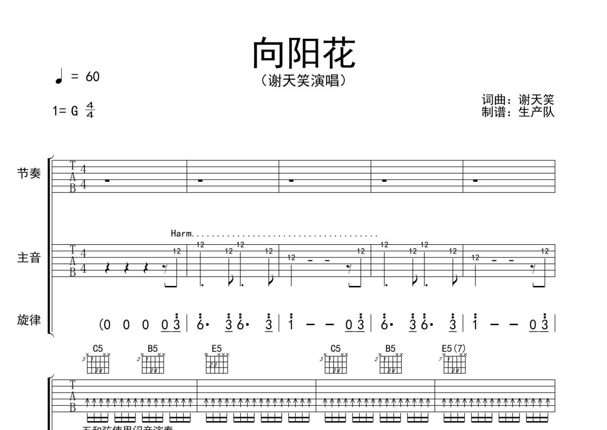 《向阳花》是谢天笑演唱的一首歌曲,歌曲速度为每分钟60拍,歌曲原调为G调,本吉他谱采用的是G调指法编配,演奏时不需要使用变调夹即为原调,这份吉他谱共有七张高清图谱,图谱由 @生产队 编配上传,图谱使用六线谱编配,包含吉他和弦指法、简谱以及歌词部分,使用这份向阳花吉他谱,可以让你更加方便地掌握这首歌曲的弹唱技巧,快来尝试吧。