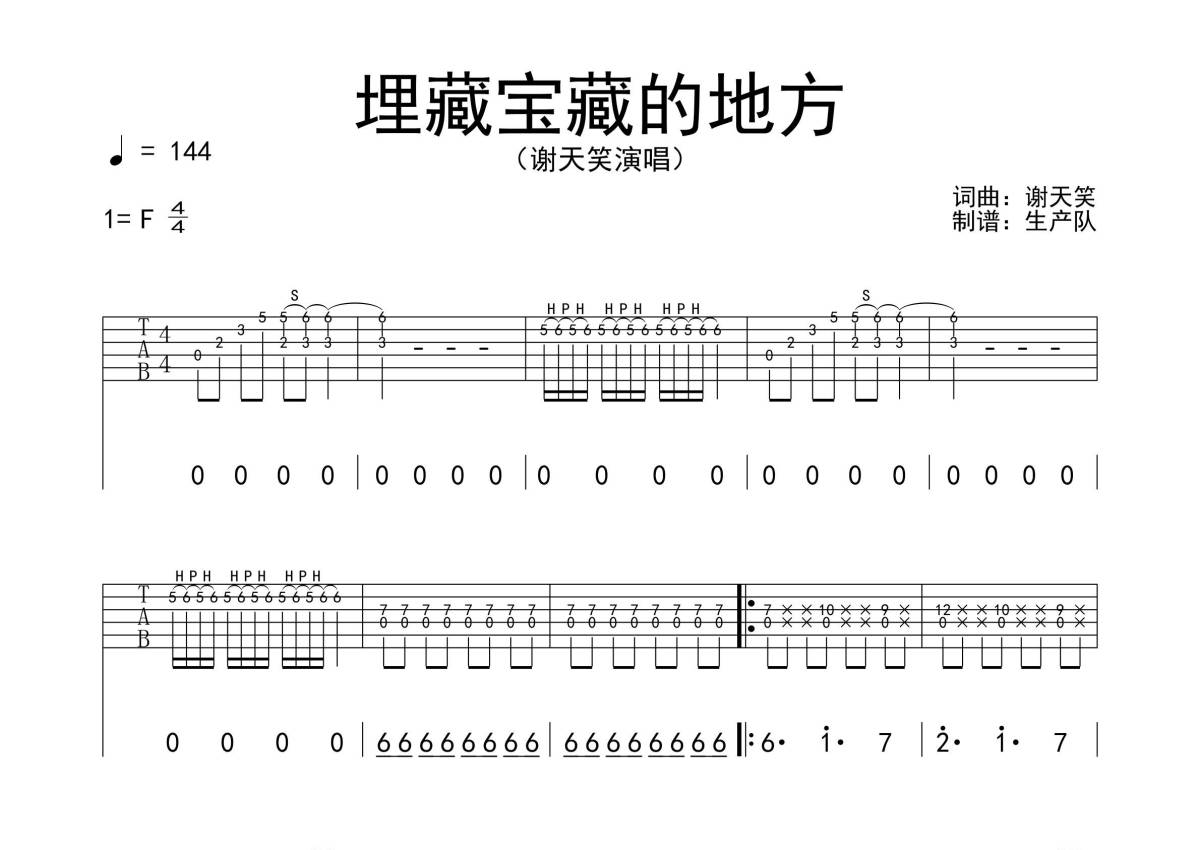 《埋藏宝藏的地方》是谢天笑演唱的一首歌曲,拍号为4/4拍,歌曲速度为每分钟144拍,歌曲原调为F调,但由于原调指法比较难,为了方便弹奏,本吉他谱采用的是F调指法编配,演奏时不需要使用变调夹即为原调,这份吉他谱共有五张高清图谱,图谱由 @生产队 编配上传,图谱使用六线谱编配,包含吉他和弦指法、简谱以及歌词部分,使用这份埋藏宝藏的地方吉他谱,可以让你更加方便地掌握这首歌曲的弹唱技巧,快来尝试吧。
