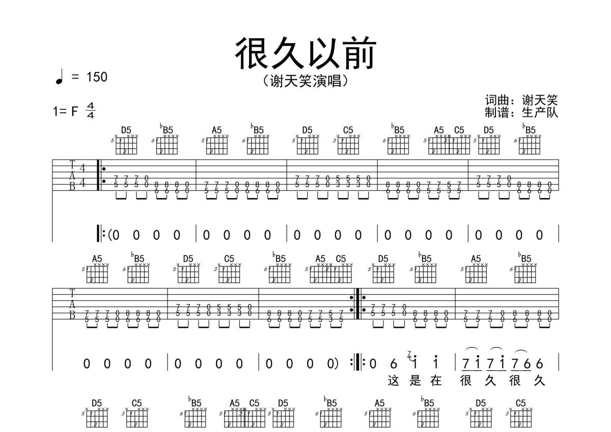 谢天笑《很久以前》吉他谱 - F调弹唱六线谱