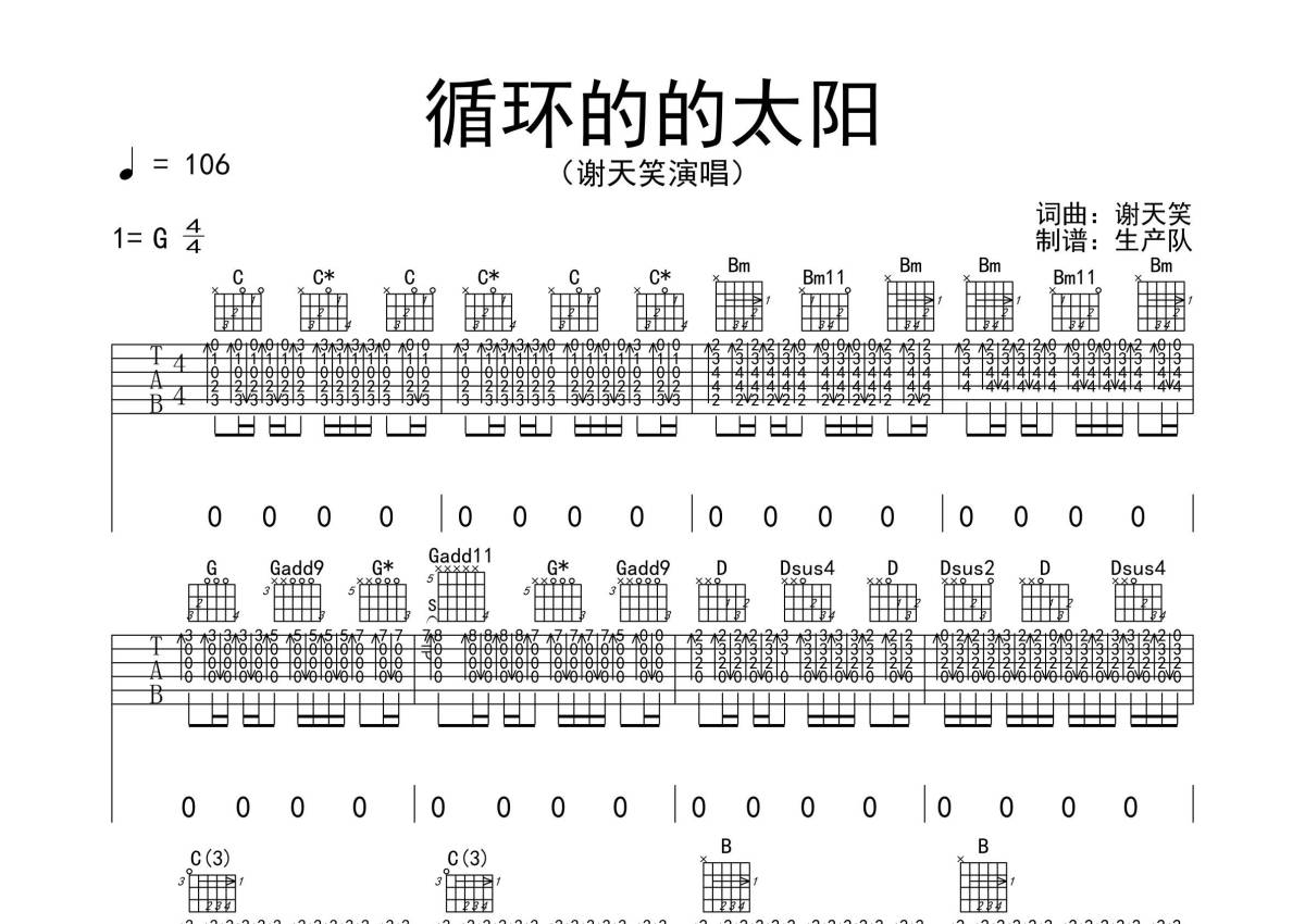 《循环的太阳》是谢天笑演唱的一首歌曲,拍号为4/4拍,歌曲速度为每分钟106拍,歌曲原调为G调,本吉他谱采用的是G调指法编配,演奏时不需要使用变调夹即为原调,这份吉他谱共有四张高清图谱,图谱由 @生产队 编配上传,图谱使用六线谱编配,包含吉他和弦指法、简谱以及歌词部分,使用这份循环的太阳吉他谱,可以让你更加方便地掌握这首歌曲的弹唱技巧,快来尝试吧。