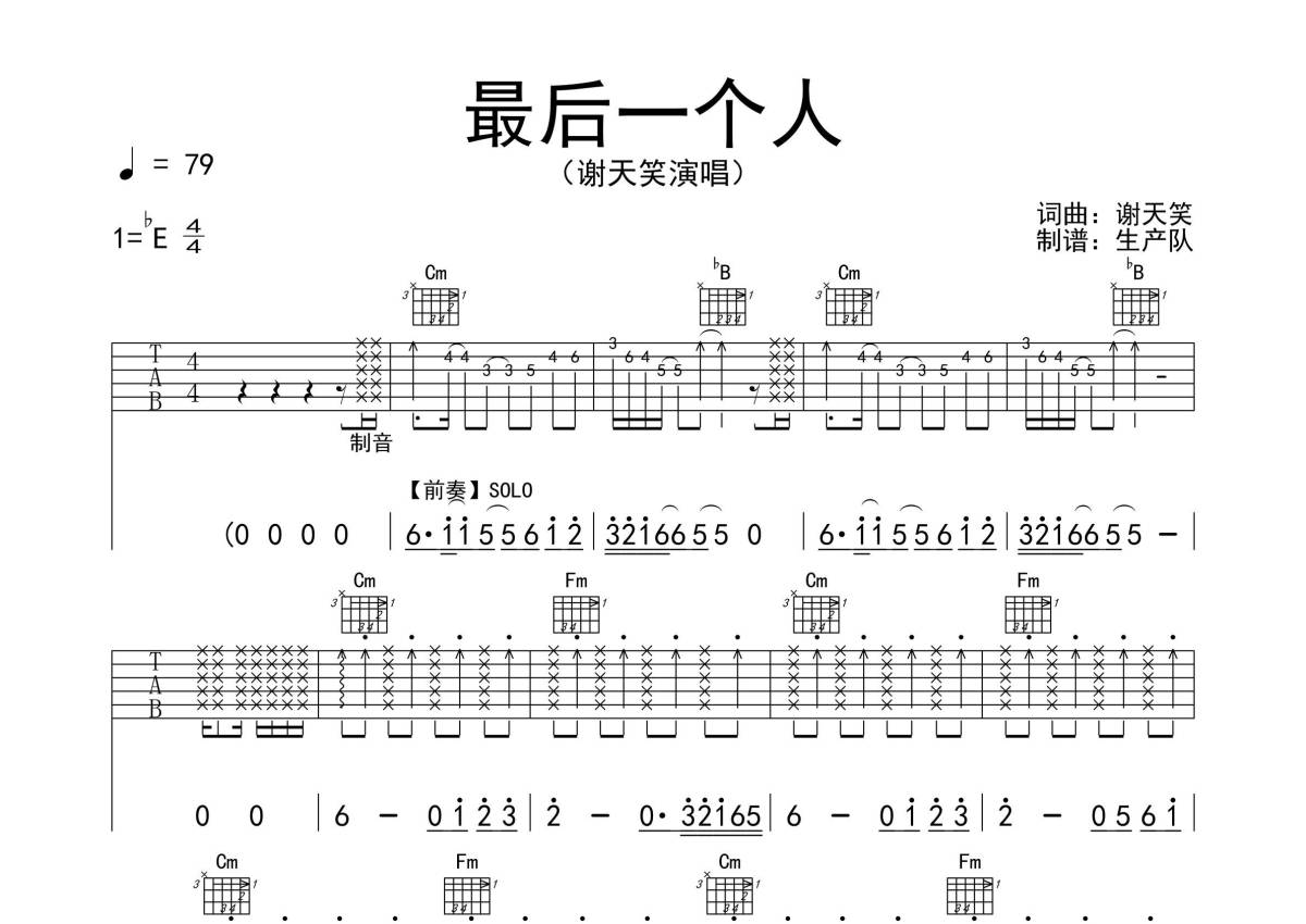 《最后一个人》是谢天笑演唱的一首歌曲,拍号为4/4拍,歌曲速度为每分钟79拍,歌曲原调为Eb调,这份吉他谱共有四张高清图谱,图谱由 @生产队 编配上传,图谱使用六线谱编配,包含吉他和弦指法、简谱以及歌词部分,使用这份最后一个人吉他谱,可以让你更加方便地掌握这首歌曲的弹唱技巧,快来尝试吧。