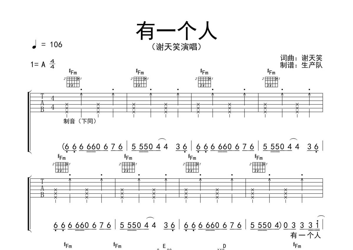 《有一个人》是谢天笑演唱的一首歌曲,拍号为4/4拍,歌曲速度为每分钟106拍,歌曲原调为A调,但由于原调指法比较难,为了方便弹奏,本吉他谱采用的是A调指法编配,演奏时不需要使用变调夹即为原调,这份吉他谱共有四张高清图谱,图谱由 @生产队 编配上传,图谱使用六线谱编配,包含吉他和弦指法、简谱以及歌词部分,使用这份有一个人吉他谱,可以让你更加方便地掌握这首歌曲的弹唱技巧,快来尝试吧。
