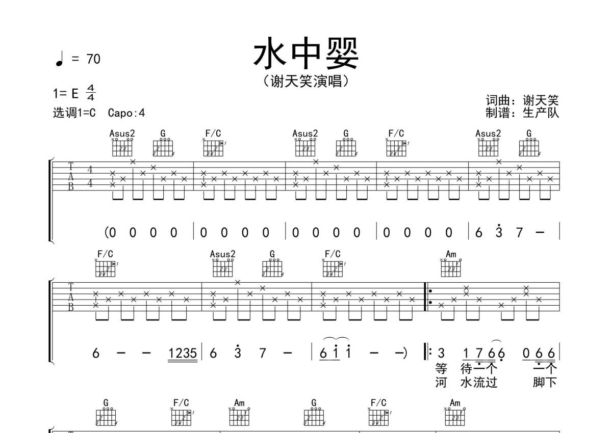 谢天笑《水中婴》吉他谱 - C调弹唱六线谱