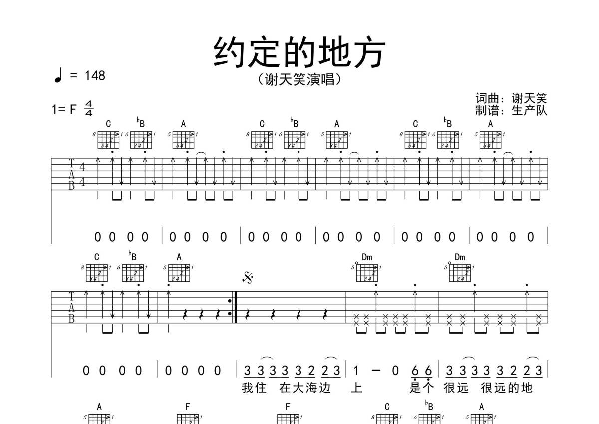 谢天笑《约定的地方》吉他谱 - F调弹唱六线谱