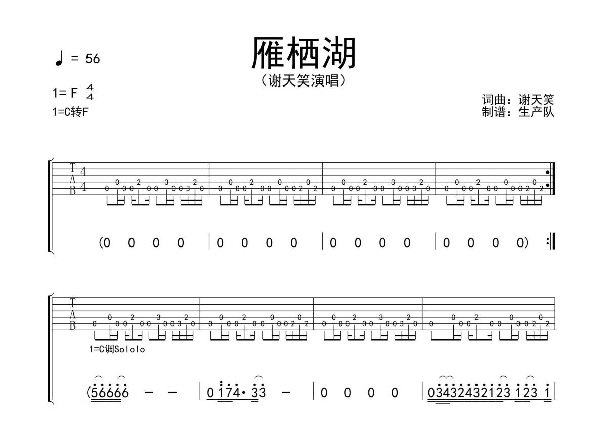 《雁栖湖》是谢天笑演唱的一首歌曲,拍号为4/4拍,歌曲速度为每分钟56拍,歌曲原调为F调,这份吉他谱共有四张高清图谱,图谱由 @生产队 编配上传,图谱使用六线谱编配,包含吉他和弦指法、简谱以及歌词部分,使用这份雁栖湖吉他谱,可以让你更加方便地掌握这首歌曲的弹唱技巧,快来尝试吧。