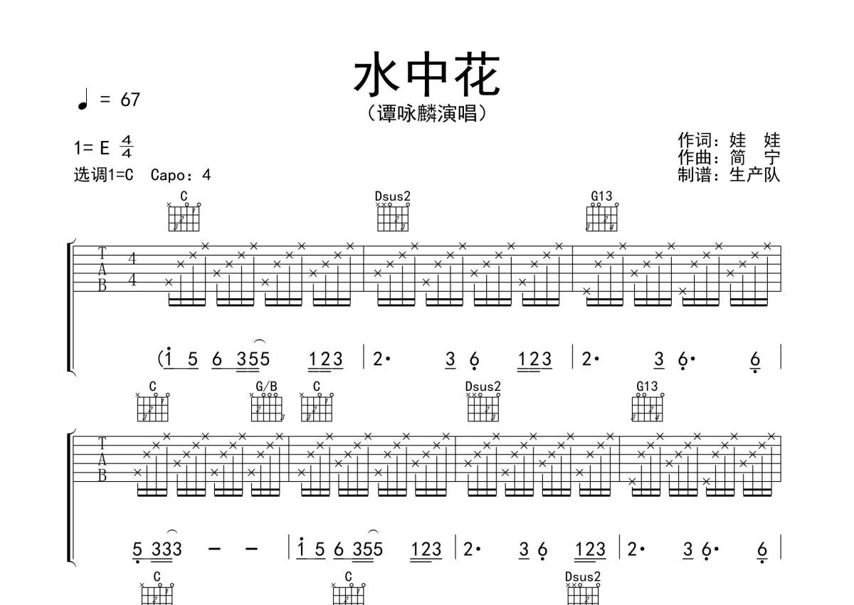《水中花》是谭咏麟演唱的一首歌曲,拍号为4/4拍,歌曲速度为每分钟67拍,歌曲原调为E调,但由于原调指法比较难,为了方便弹奏,本吉他谱采用的是C调指法编配,变调夹4品弹奏即为原调,当然也可以根据自己的音域改变变调夹位置,或者通过改变和弦调性,以方便自己弹奏,这份吉他谱共有四张高清图谱,图谱由 @生产队 编配上传,图谱使用六线谱编配,包含吉他和弦指法、简谱以及歌词部分,使用这份水中花吉他谱,可以让你更加方便地掌握这首歌曲的弹唱技巧,快来尝试吧。