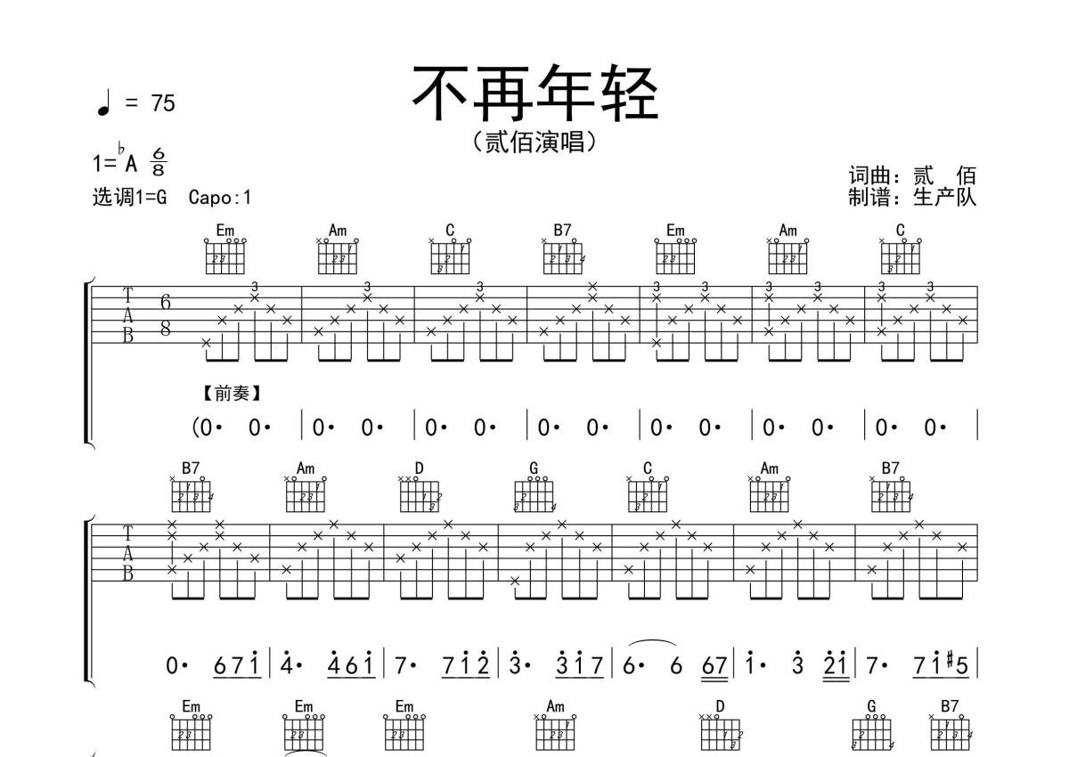 贰佰《不再年轻》吉他谱 - G调弹唱六线谱