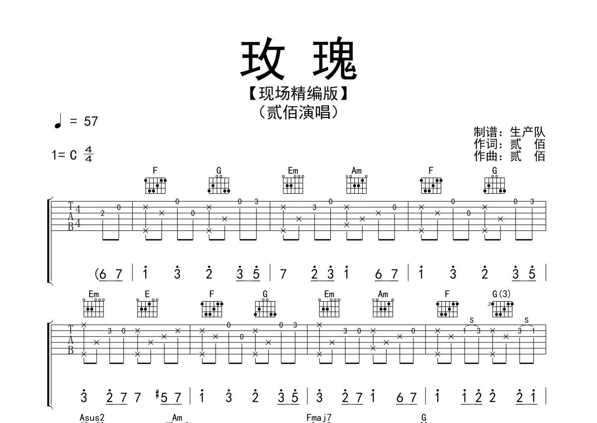 贰佰《玫瑰》吉他谱 - C调弹唱六线谱 - 现场精编版